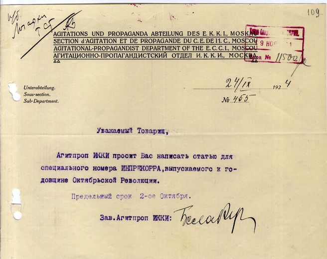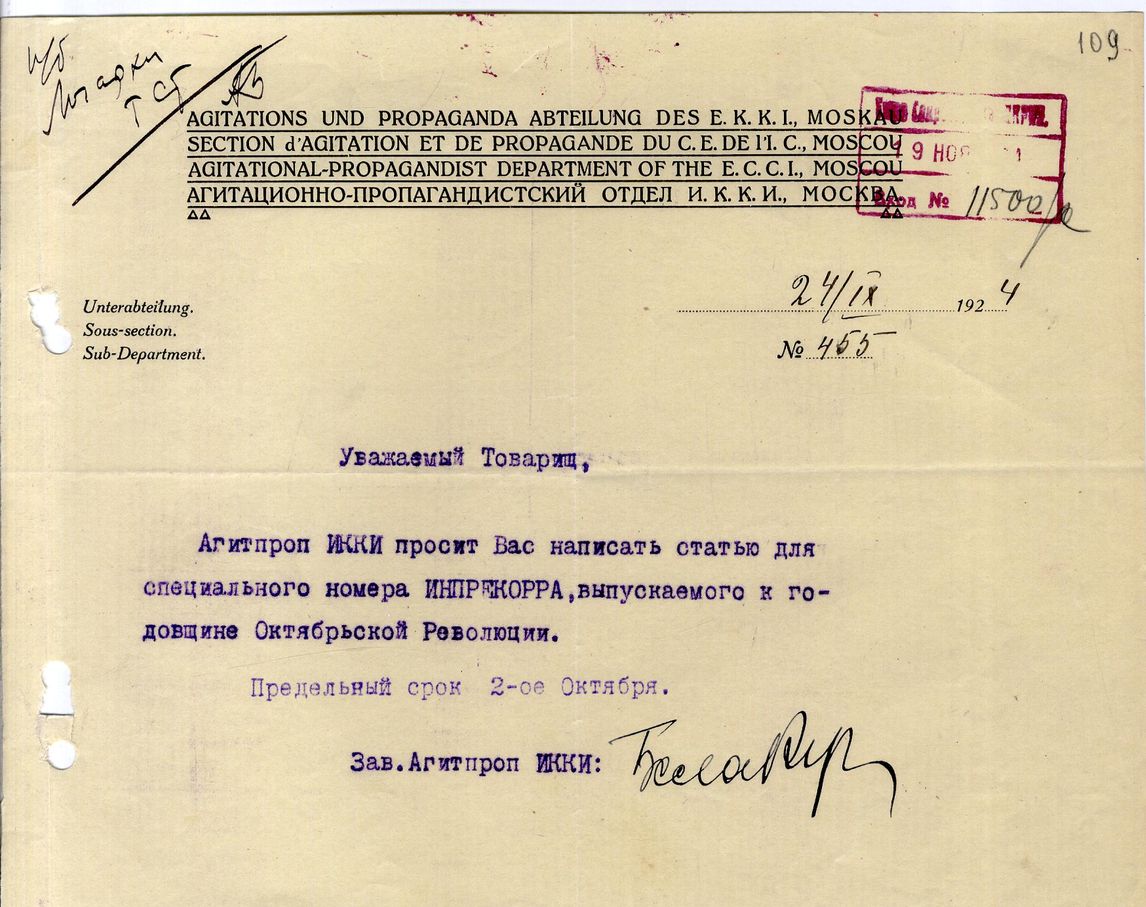 док.73: Записка товарищества "Нарпит" на имя Сталина И.В. с просьбой написать статью.