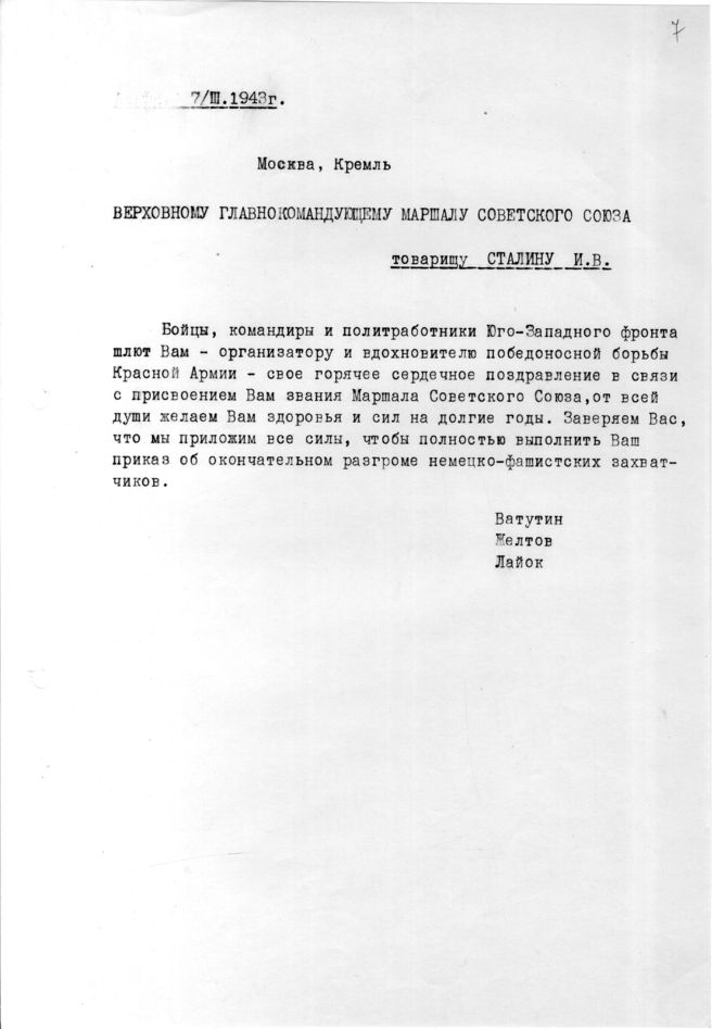 док.7: Приветствие Сталину И.В. бойцов, командиров и политработников Юго-Западного фронта в связи с присвоением ему звания - Маршал Советского Союза.