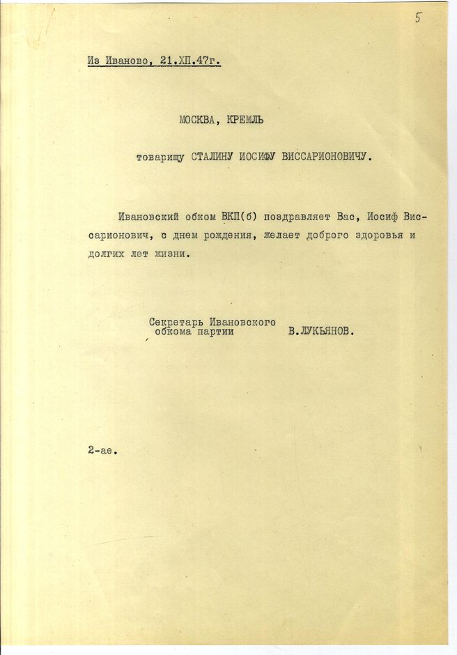 док.4: Приветственная телеграмма секретаря Ивановского обкома ВКП(б) Лукьянова В. Сталину И.В. в связи с его 68-летием.