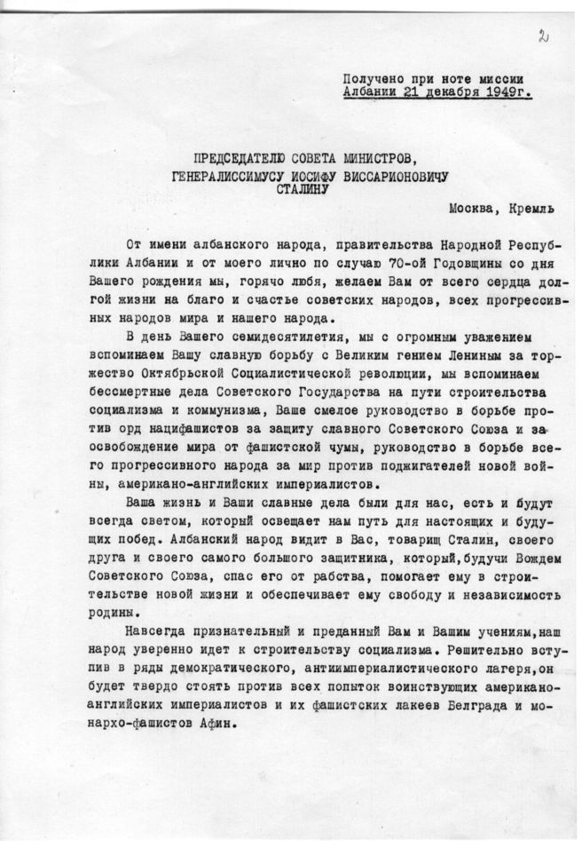 док.2: Приветственное письмо Энвера Ходжа Сталину И.В. в связи с 70-летием Сталина И.В.