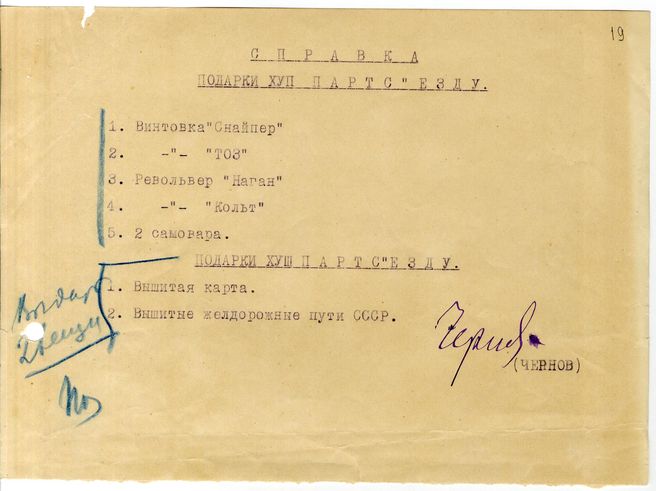 док.13: Справка с перечнем подарков, направленных в адрес 17 и 18 съездов ВКП(б).