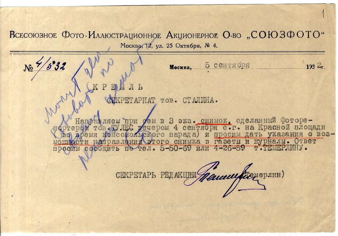 док.1: Записка редакции акционерного общества "Союзфото" в секретариат Сталина с просьбой разрешить направить фотоснимок Сталина на Красной площади в газеты и журналы.