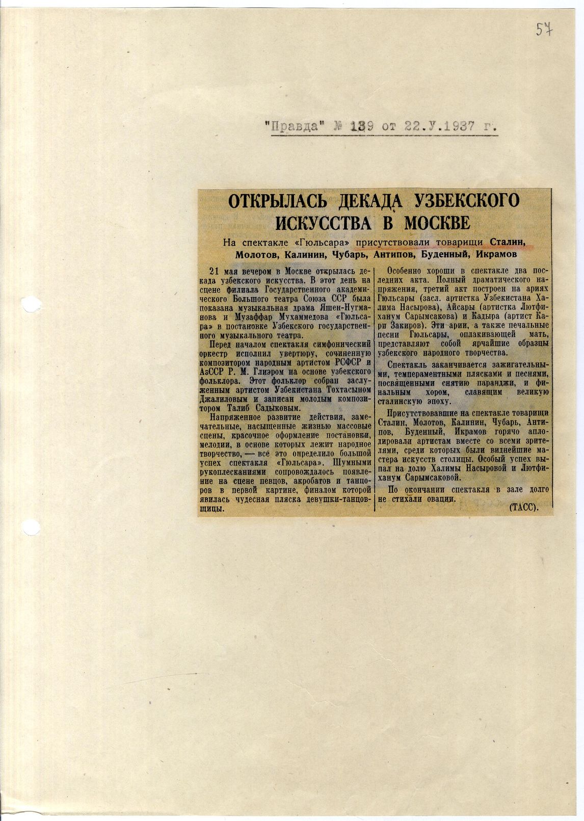 док.37: Вырезка из газеты "Правда" о присутствии Сталина на спектакле "Гюльсара", состоявшемся в Большом театре во время декады узбекского искусства в Москве.