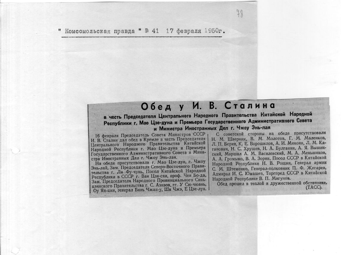 док.76: Вырезка из газеты "Комсомольская правда" со статьей "Обед у И.В.Сталина в честь председателя Центрального народного правительства КНР Мао Цзэдуна и премьера Государственного административного совета КНР, министра иностранных дел КНР Чжоу Эньлая".