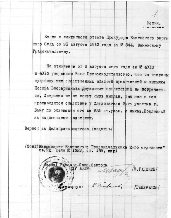 Сообщение прокурора Бакинского окружного суда Бакинскому градоначальнику о высылке под надзор полиции Джугашвили И.В. и проведении следствия по делу Сверчкова И.