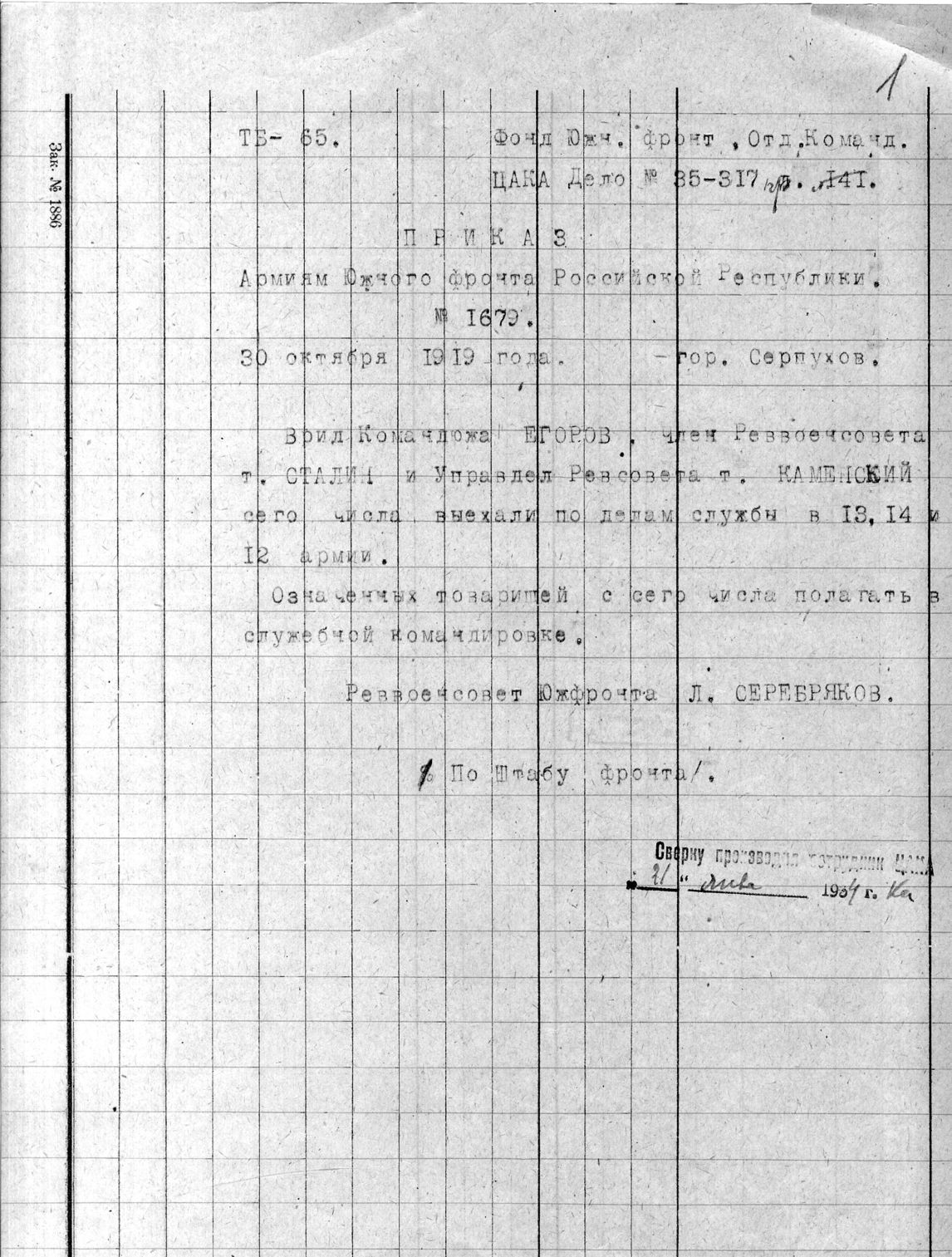 Приказ № 1679 РВС Южного фронта с извещением о выезде на фронт члена Реввоенсовета Сталина И.В. и управляющего делами РВС Каменского.