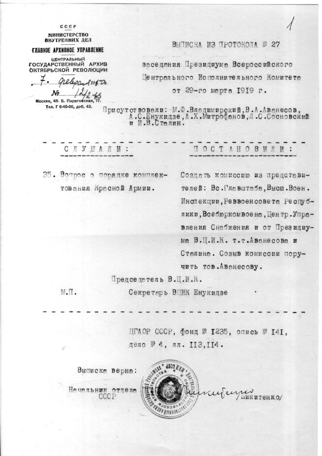 Архивная выписка ЦГАОР СС из протокола № 18 заседания Президиума ВЦИК от 29 марта 1919 г.: п. 35 – о порядке комплектования Красной Армии.