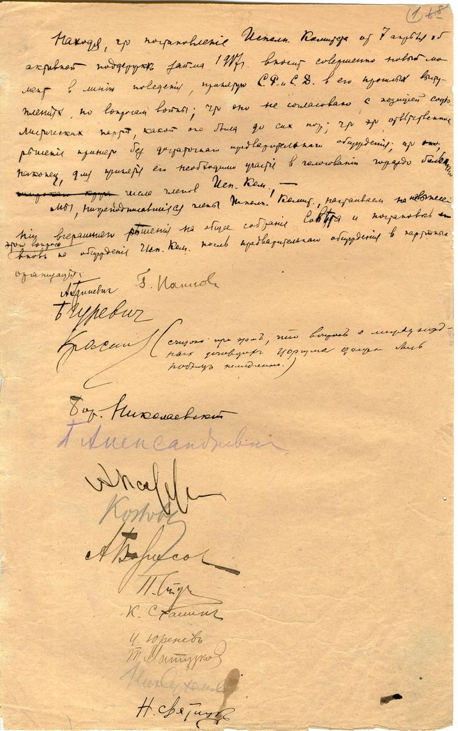 Протест отдельных членов Исполнительного комитета Петроградского Совета против постановления Исполкома Петроградского Совета от 7 апреля 1917 г. об активной поддержке займа 1917 г.; имеются подписи: Сталина И.В., Николаевского Б.И., Гриневича А., Гуревича