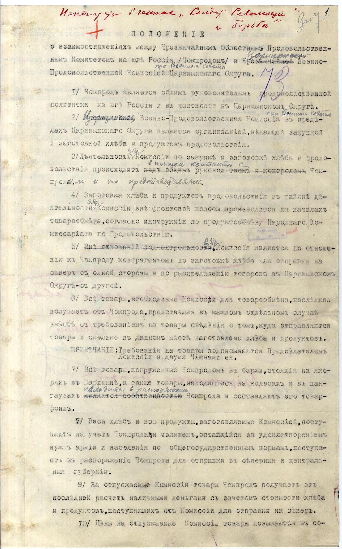 Положение о взаимоотношениях между Чрезвычайным областным продовольственным комитетом на Юге России (Чокпродом) и Царицынской военно-продовольственной комиссией при Военном совете Царицынского округа, с зачеркиванием и надписями Сталина. Подписи: Сталин,