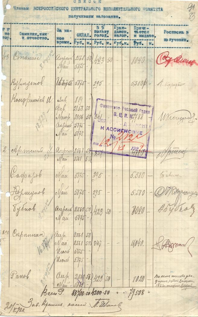 Список членов ВЦИК с распиской Сталина И.В. в получении жалованья. Имеются расписки других лиц. [20 мая 1922 г.]