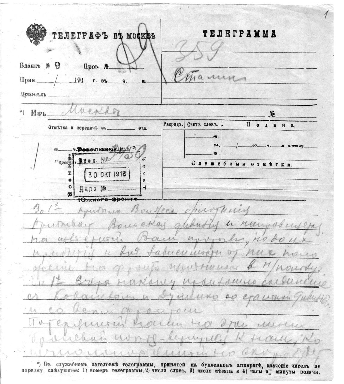 Разговор по прямому проводу Сталина И.В. и Ворошилова К.Е. о положении на Царицынском фронте, с обещанием Сталина И.В. передать ленту разговора Ленину В.И. и принять меры к обеспечению царицынских войск вооружением, с передачей приветствия Сталина И.В. Мо
