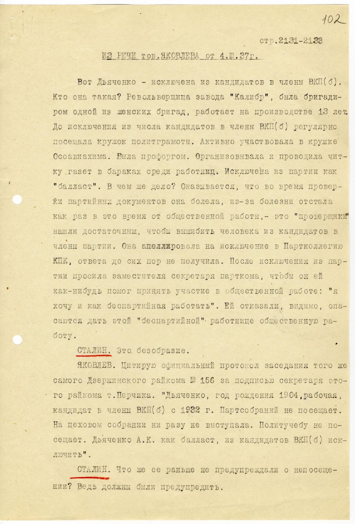 Документ 28. док.28: Реплика Сталина И.В. из речи Яковлева Я.А. на пленуме ЦК ВКП(б)