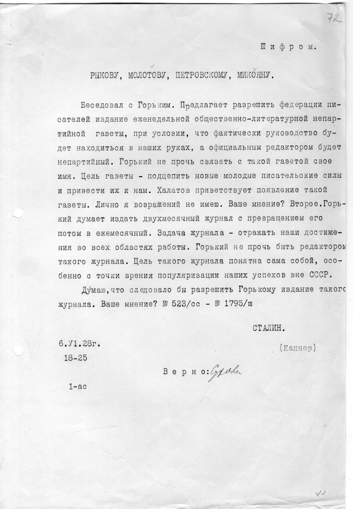 док.34: Шифротелеграмма Сталина И.В. Рыкову А.И., Молотову В.М., Петровскому Г.И. и Микояну А.И. в связи с предложениями Горькго А.М. об издании еженедельной общественно-литературной непартийной газеты и двухмесячного журнала.