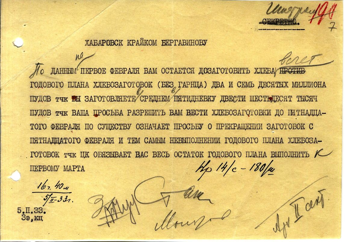 док.4: Шифротелеграмма Сталина И.В. и Молотова В.М. в Хабаровск Бергавинову С.А. о выполнении план хлебозаготовок к 1 марта.